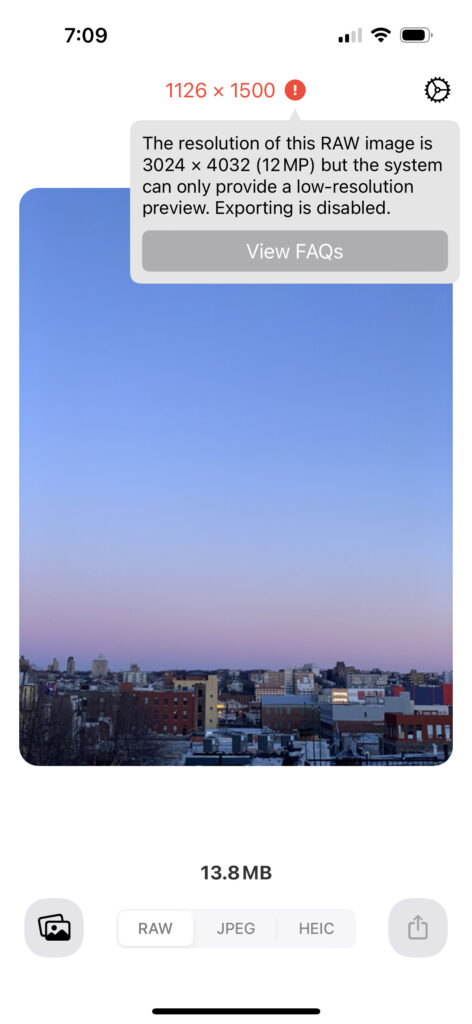 When SMAWL loads the RAW photo, it checks to see that the image it receives matches the dimension of the RAW photo. When the dimensions of the loaded image are smaller than the RAW photo, SMAWL will show a warning. Because the preview image isn’t the actual RAW file, it wouldn’t be safe to convert this photo, so SMAWL disables the preview and export buttons.